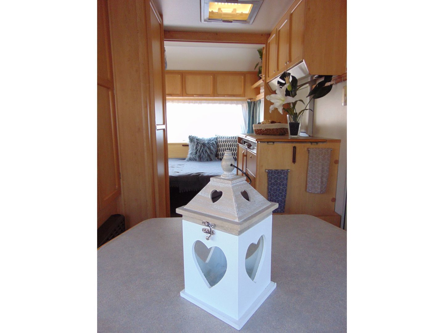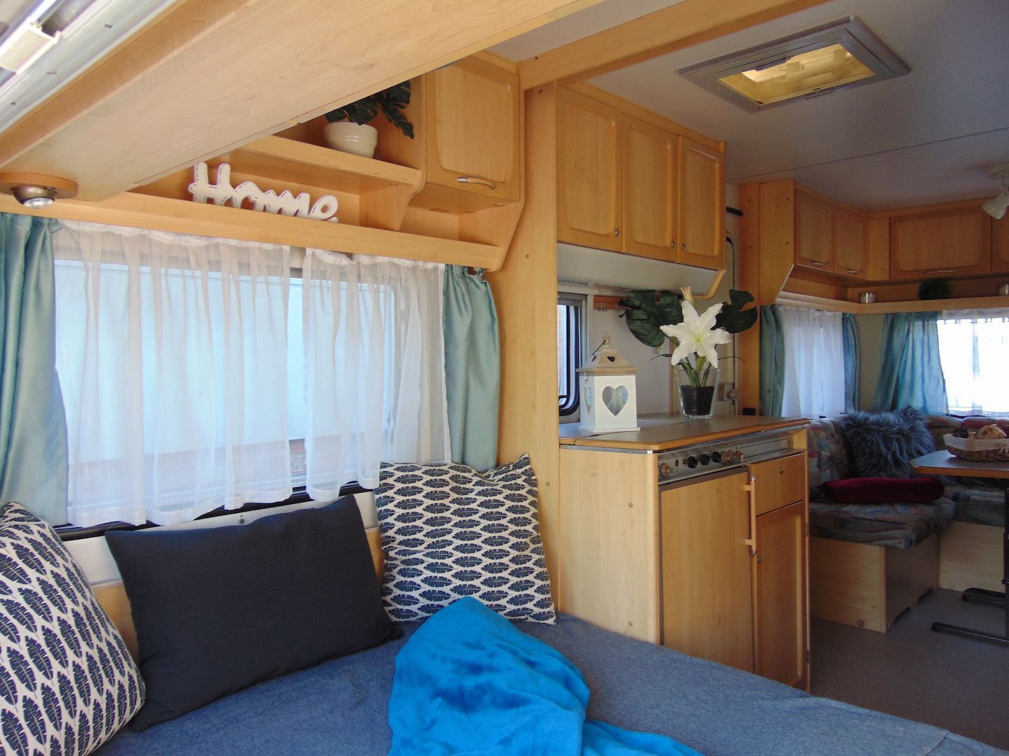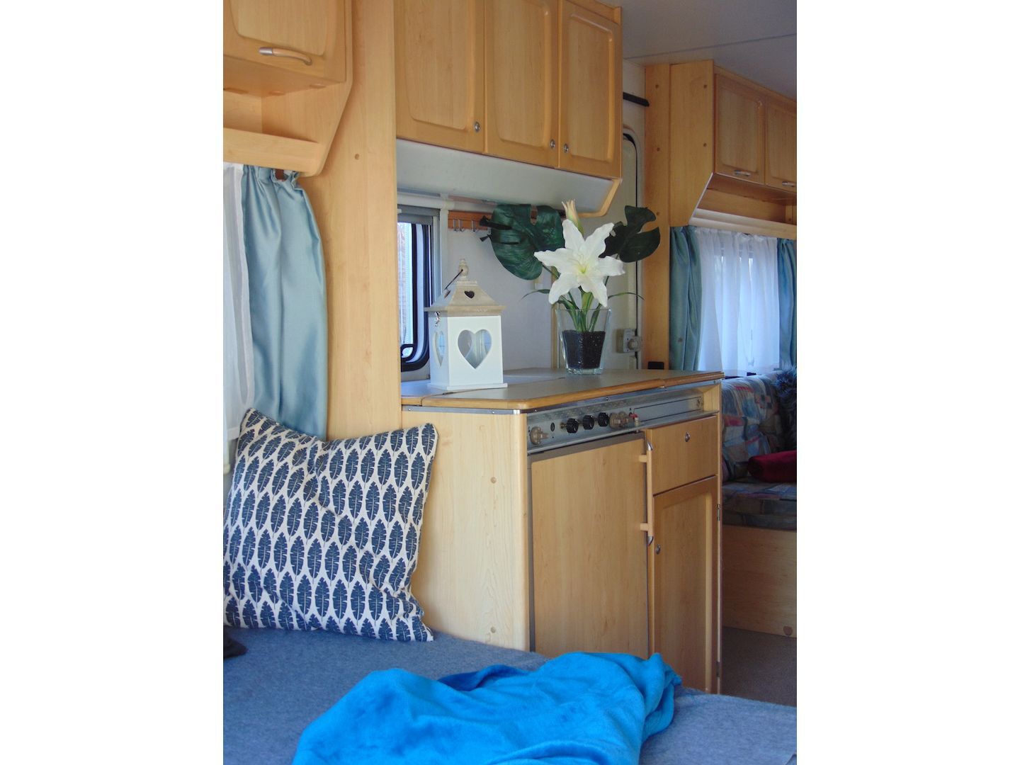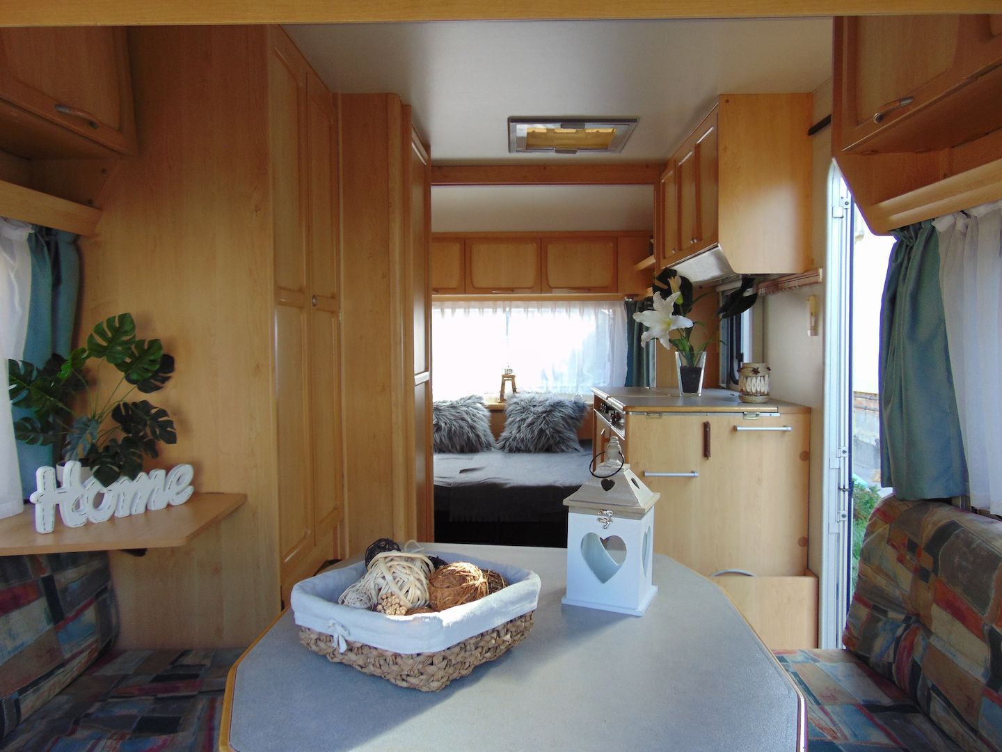 Van benne két franciaágy - egyik leválasztható és a másik asztallá, ülősarokká alakítható -, konyharész hűtővel, gáztűzhellyel, mosogatóval, klíma, mosdó, WC. Van még egy zárt elősátra is asztallal, székekkel.