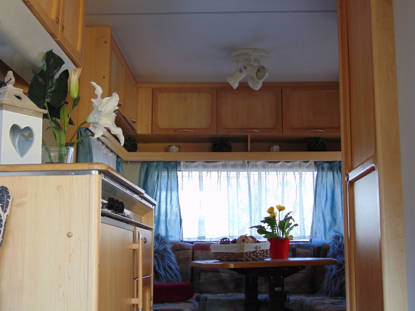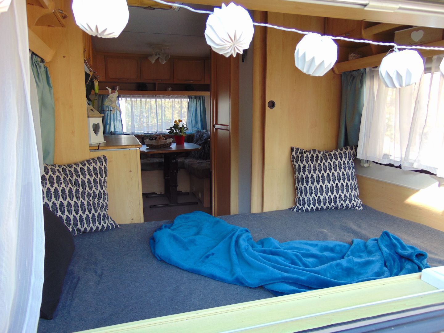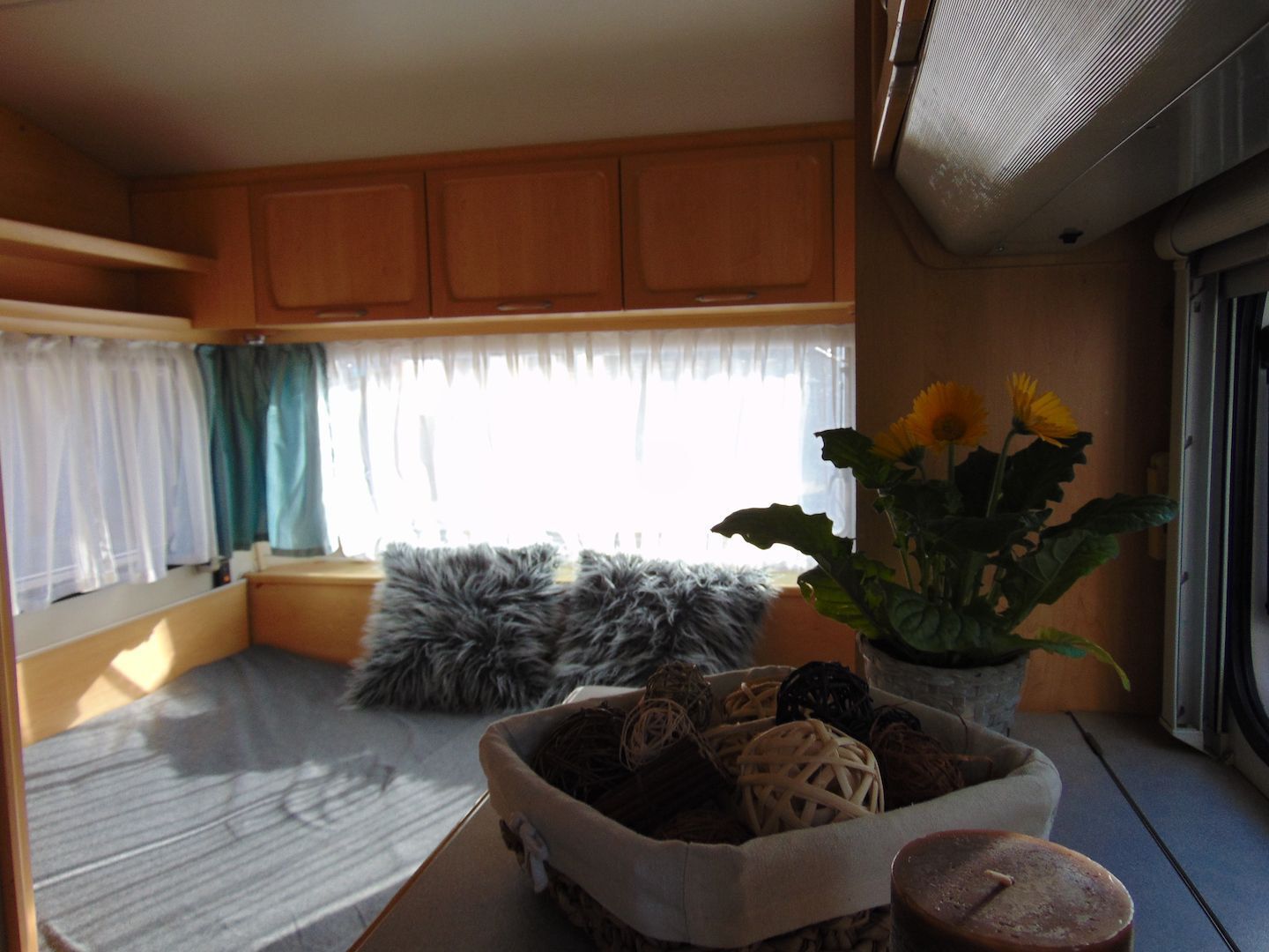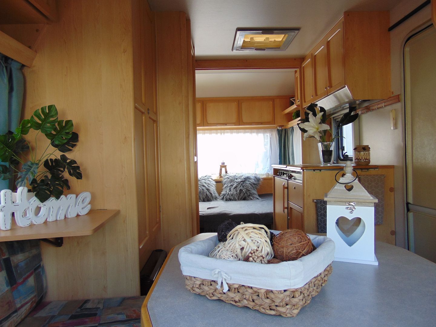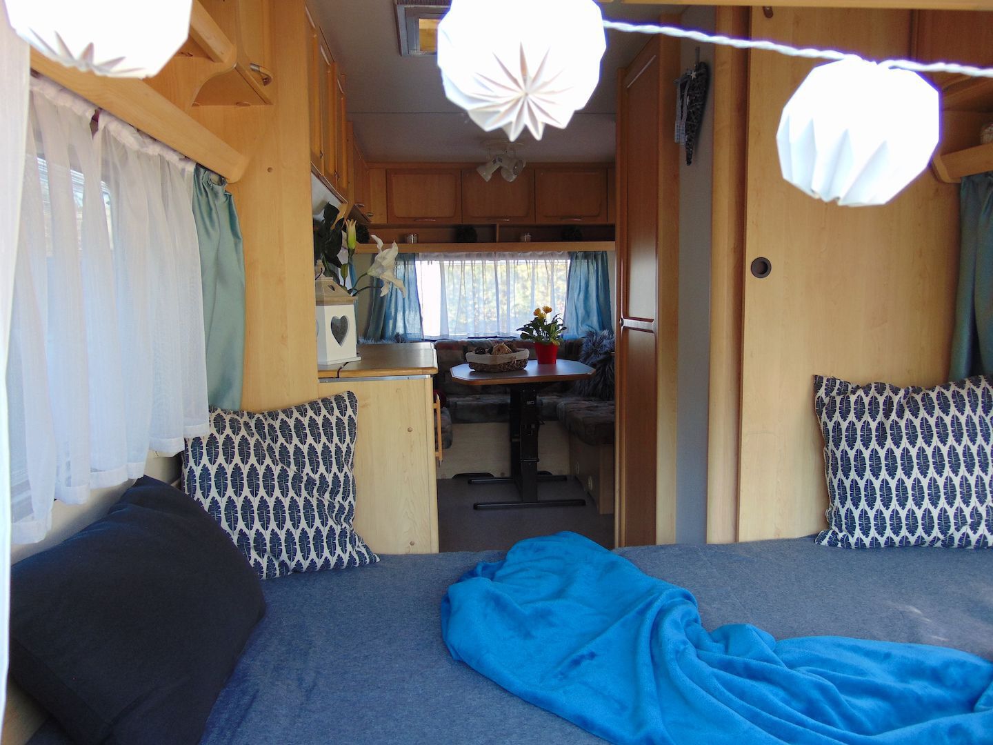 Van benne két franciaágy - egyik leválasztható és a másik asztallá, ülősarokká alakítható -, konyharész hűtővel, gáztűzhellyel, mosogatóval, klíma, mosdó, WC. Van még egy zárt elősátra is asztallal, székekkel.