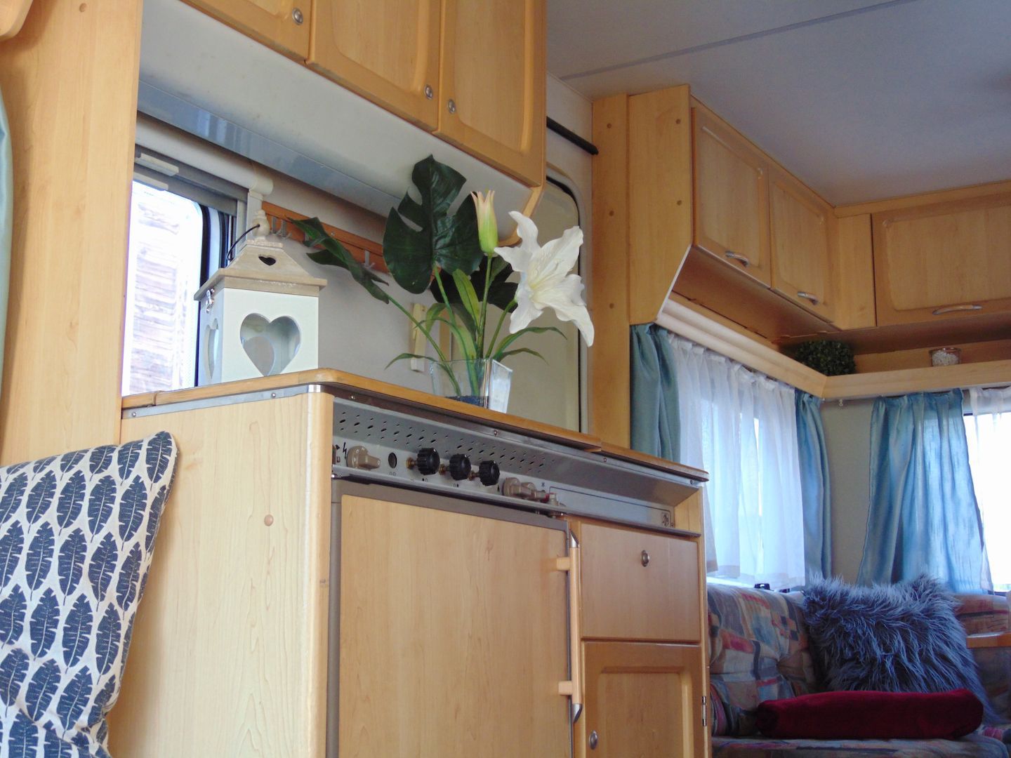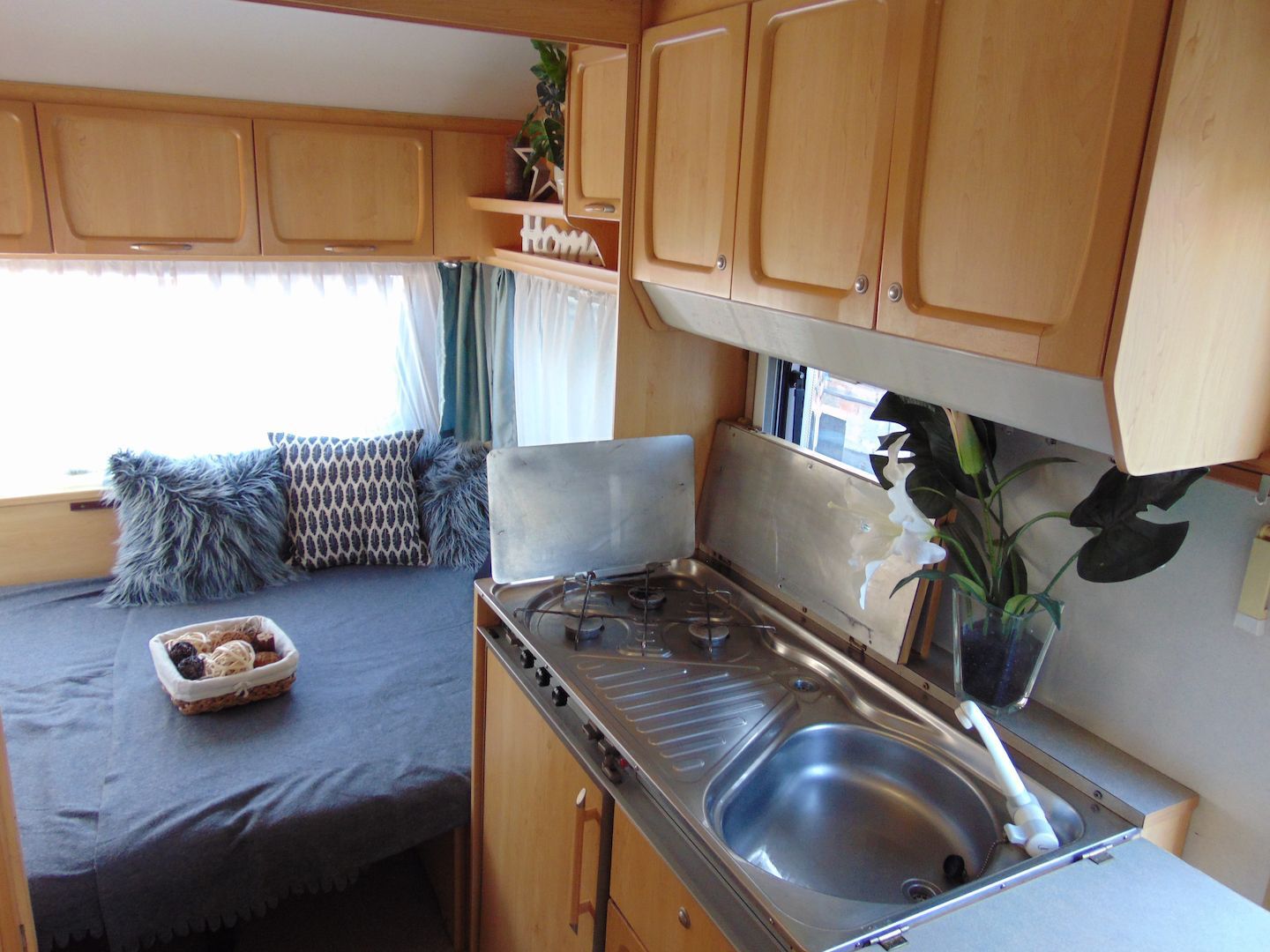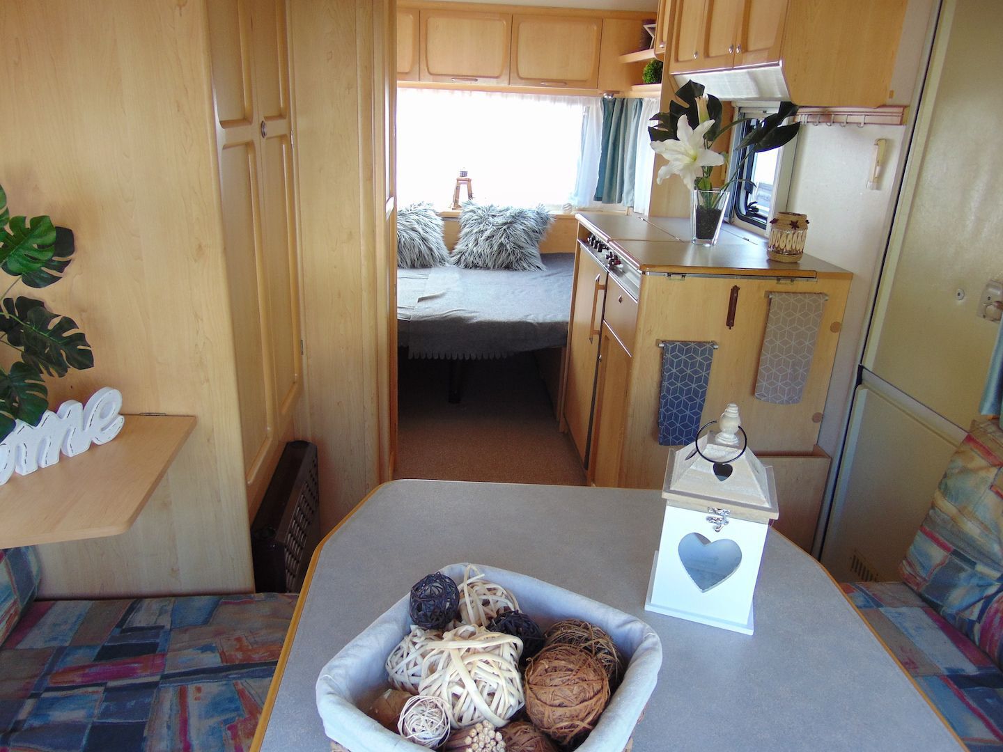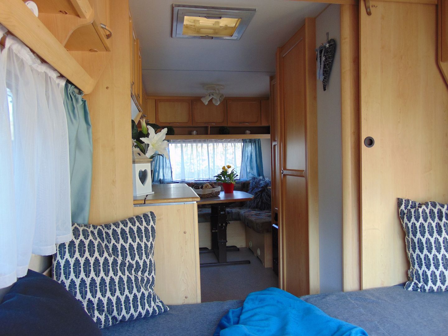 Van benne két franciaágy - egyik leválasztható és a másik asztallá, ülősarokká alakítható -, konyharész hűtővel, gáztűzhellyel, mosogatóval, klíma, mosdó, WC. Van még egy zárt elősátra is asztallal, székekkel.