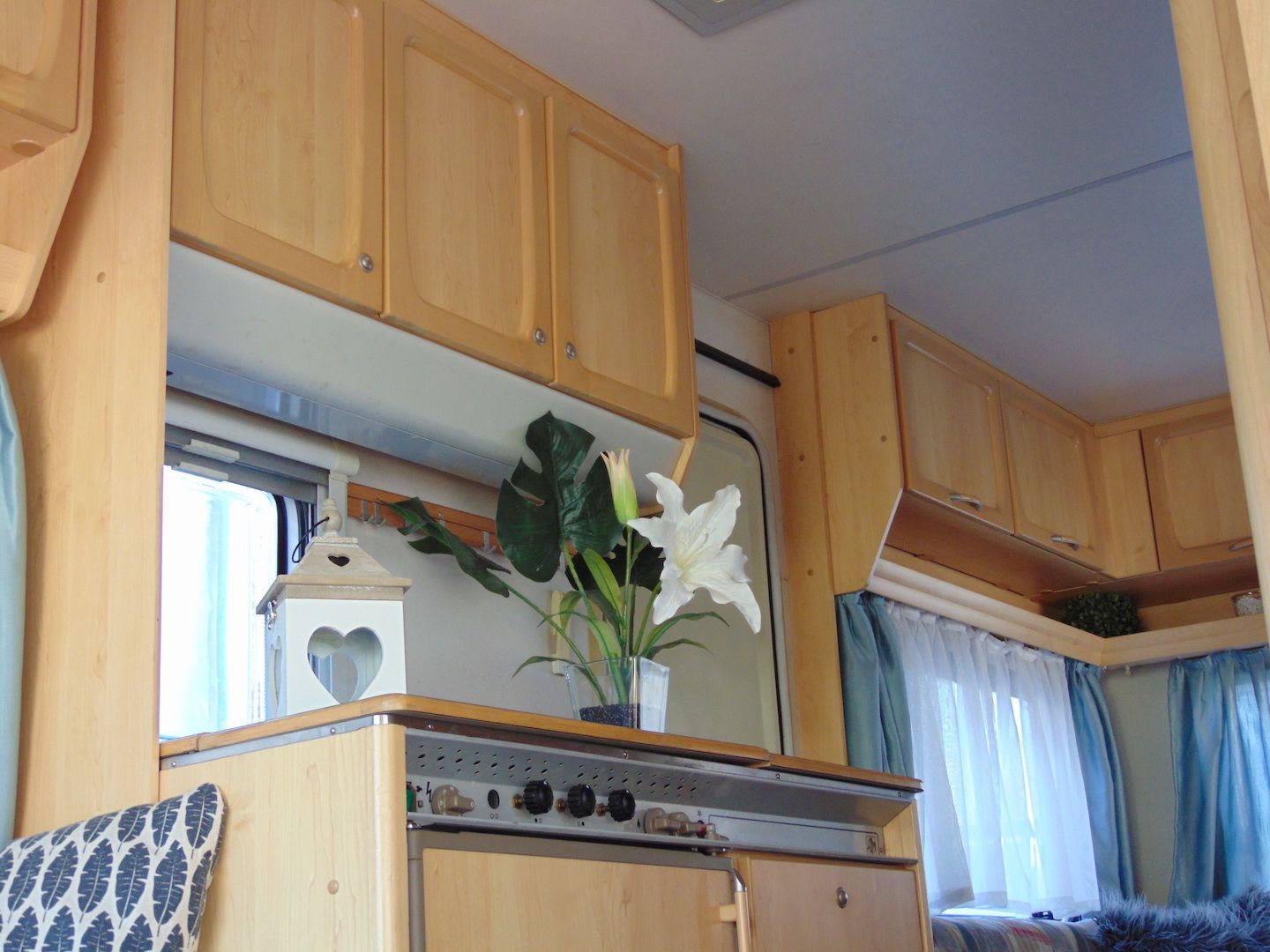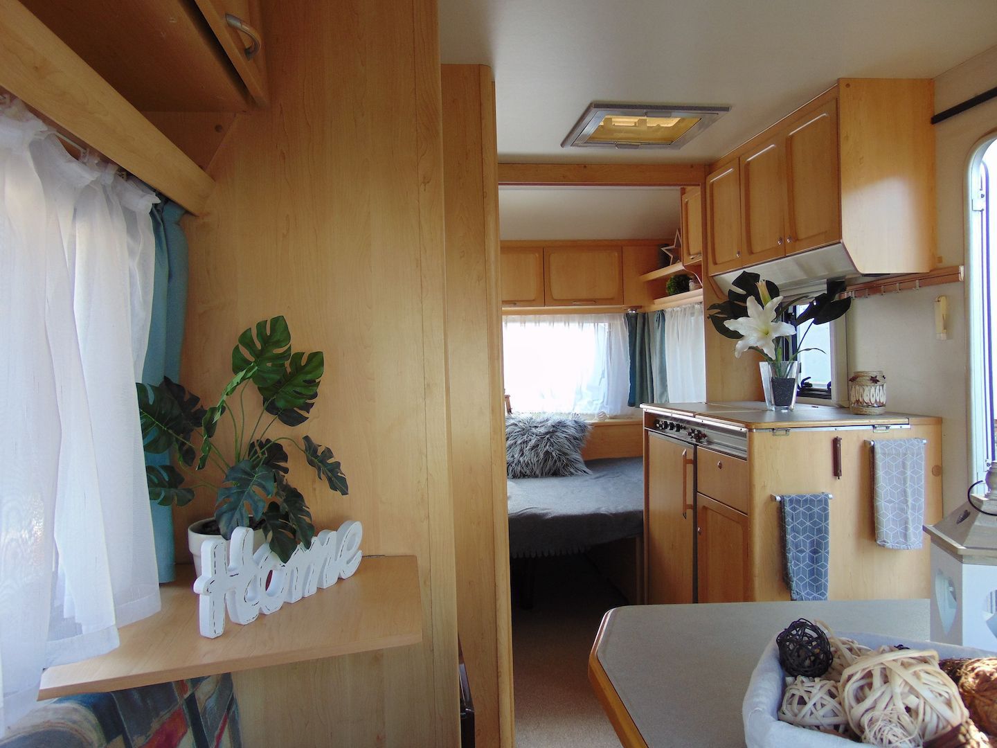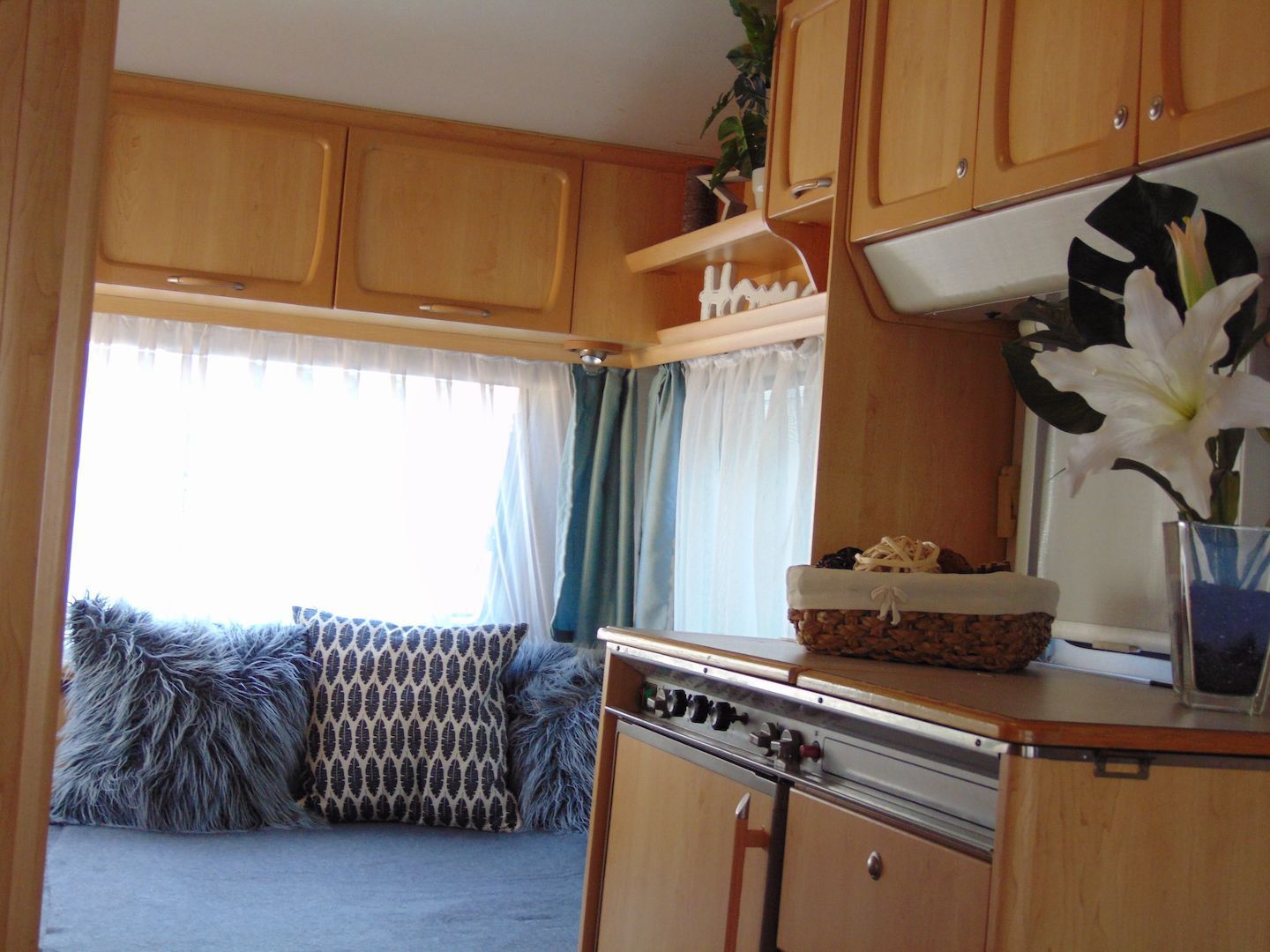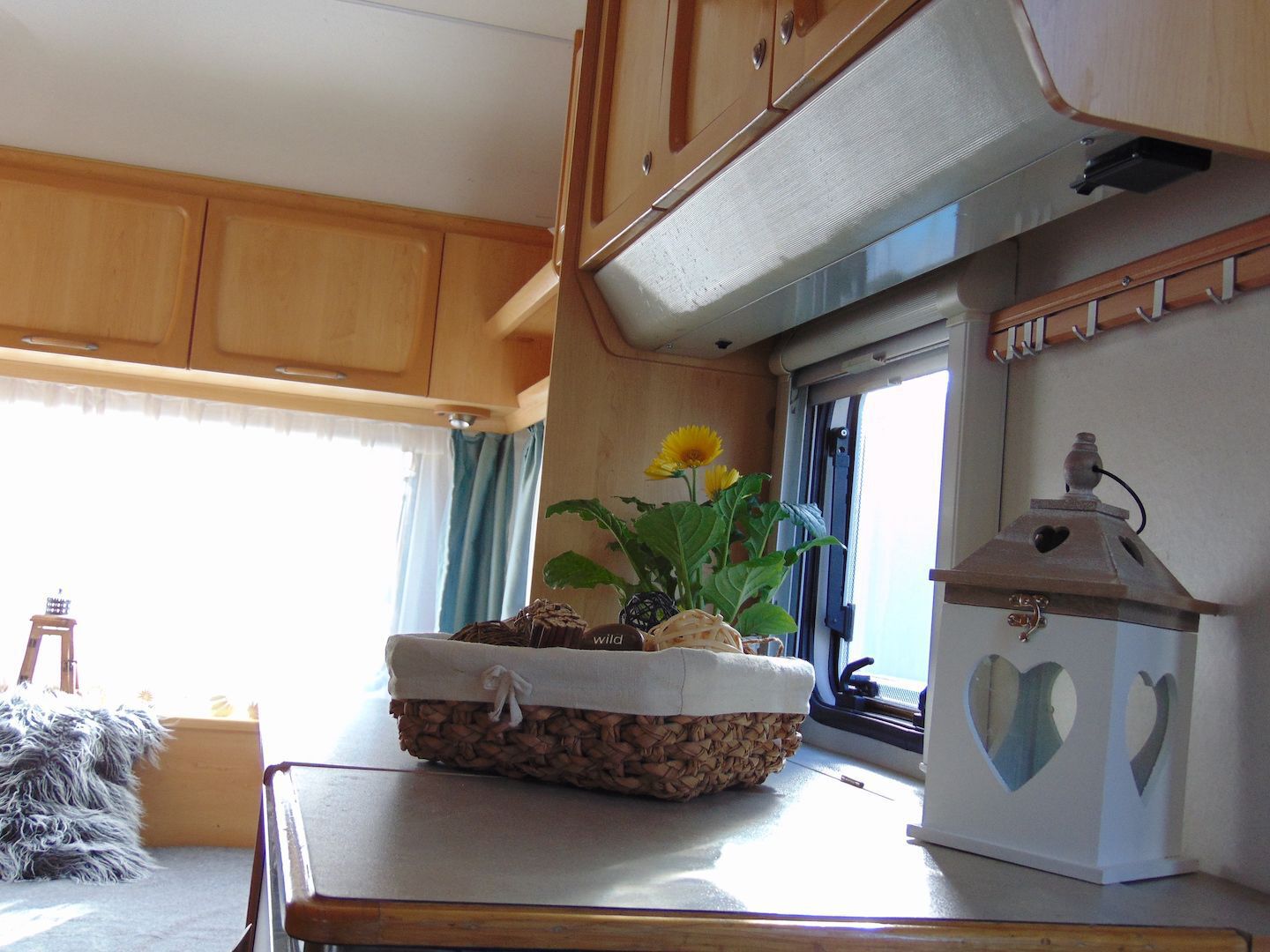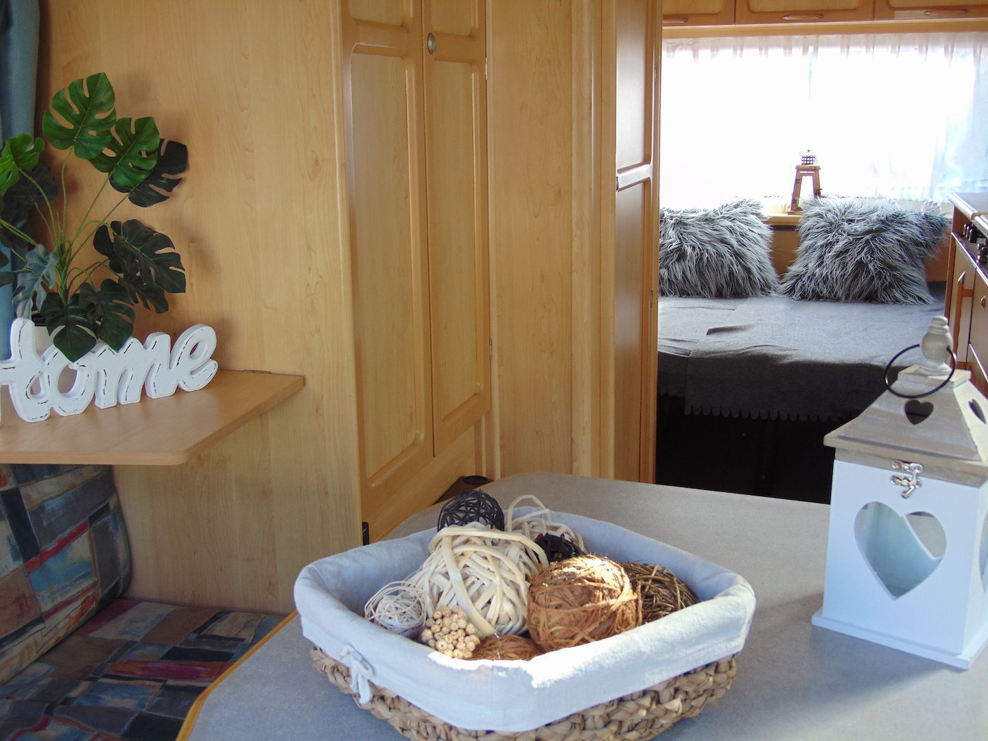 Van benne két franciaágy - egyik leválasztható és a másik asztallá, ülősarokká alakítható -, konyharész hűtővel, gáztűzhellyel, mosogatóval, klíma, mosdó, WC. Van még egy zárt elősátra is asztallal, székekkel.