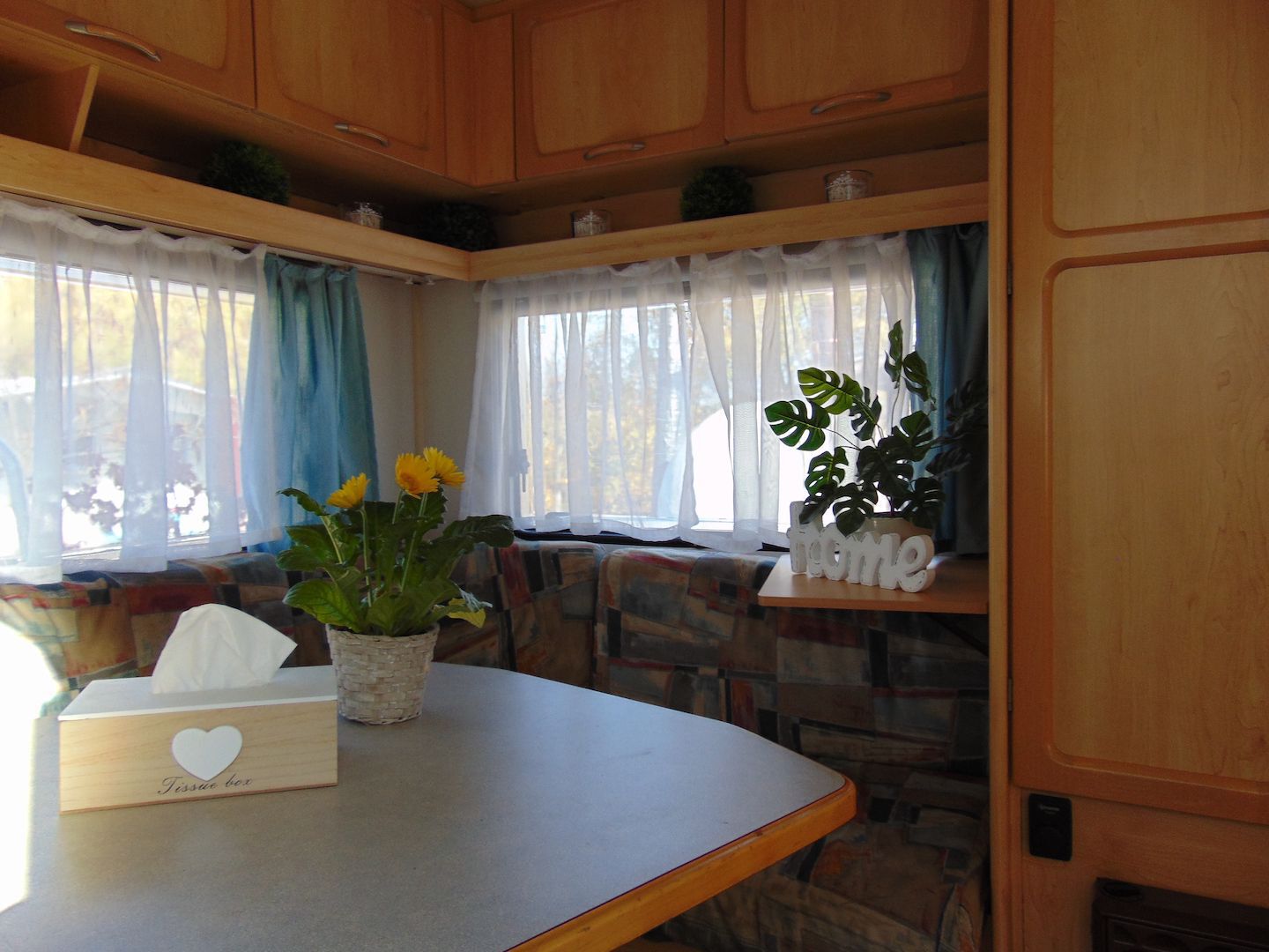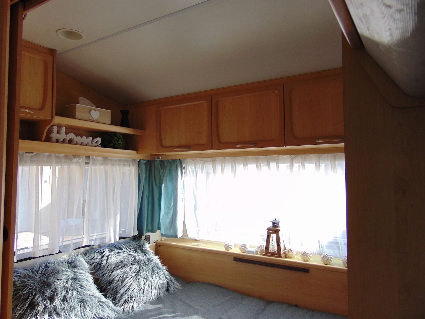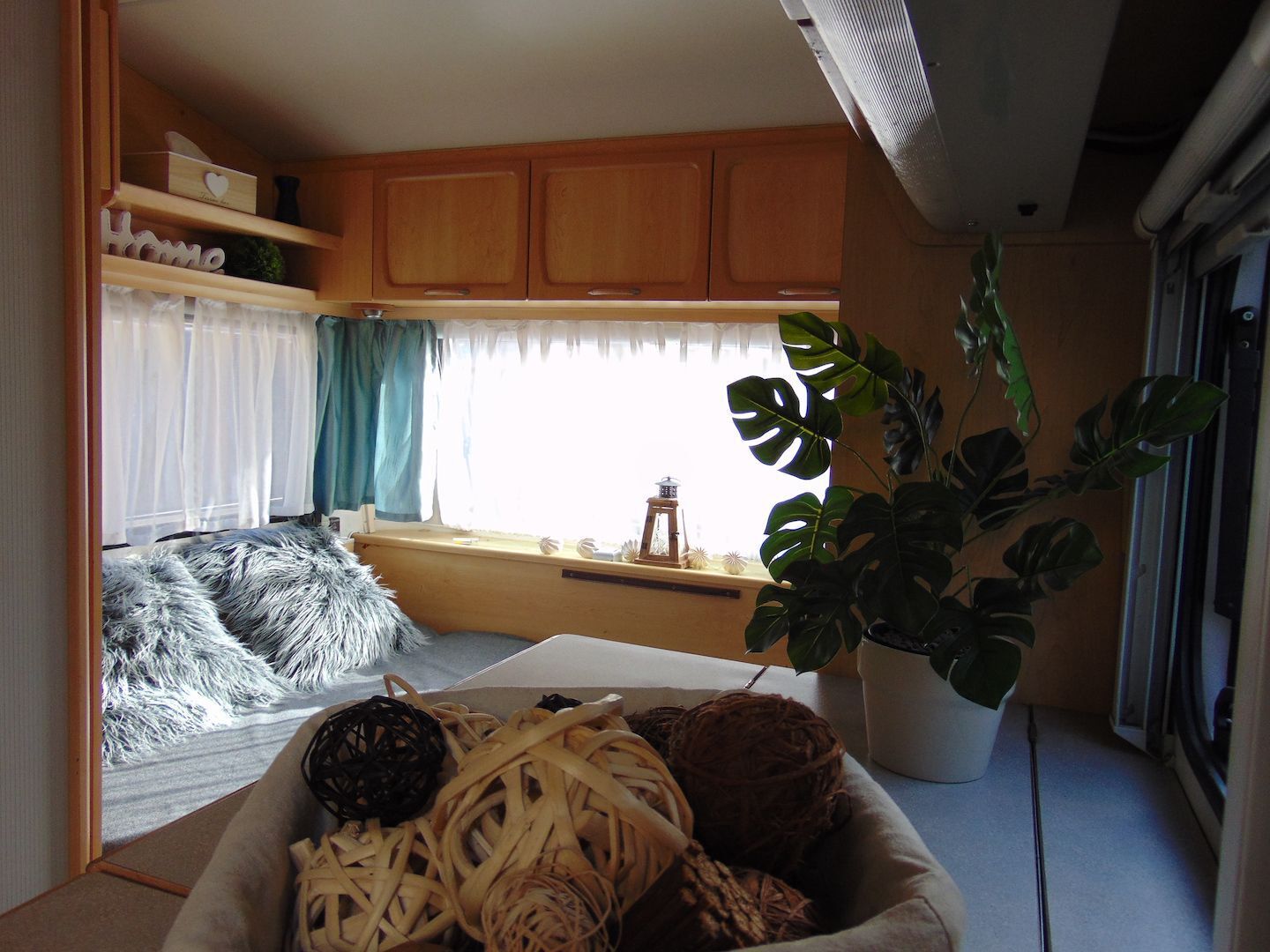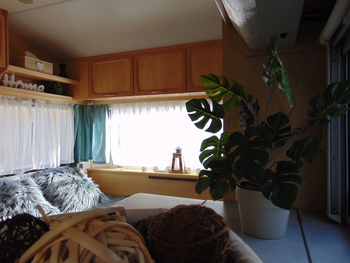 Van benne két franciaágy - egyik leválasztható és a másik asztallá, ülősarokká alakítható -, konyharész hűtővel, gáztűzhellyel, mosogatóval, klíma, mosdó, WC. Van még egy zárt elősátra is asztallal, székekkel.