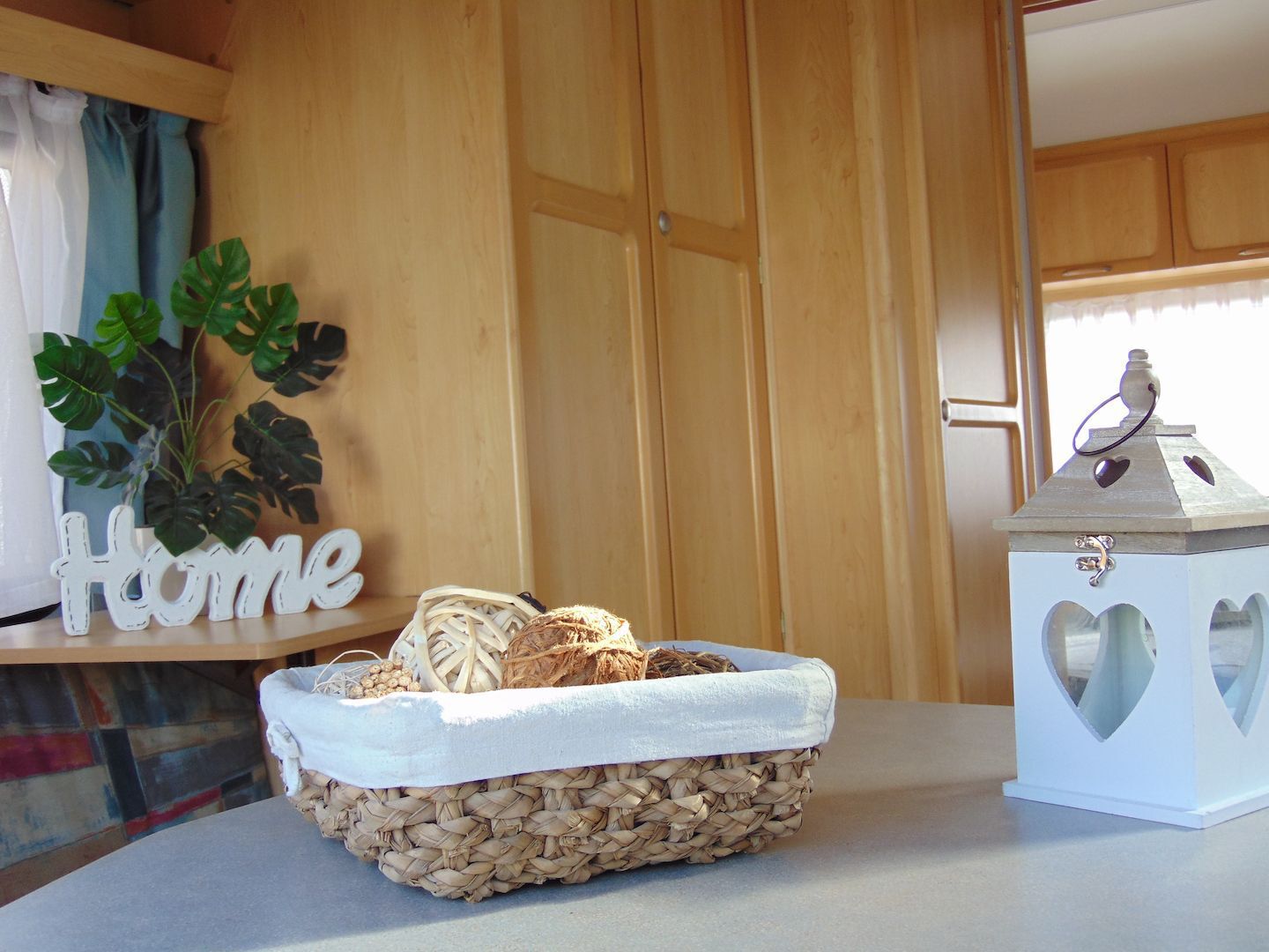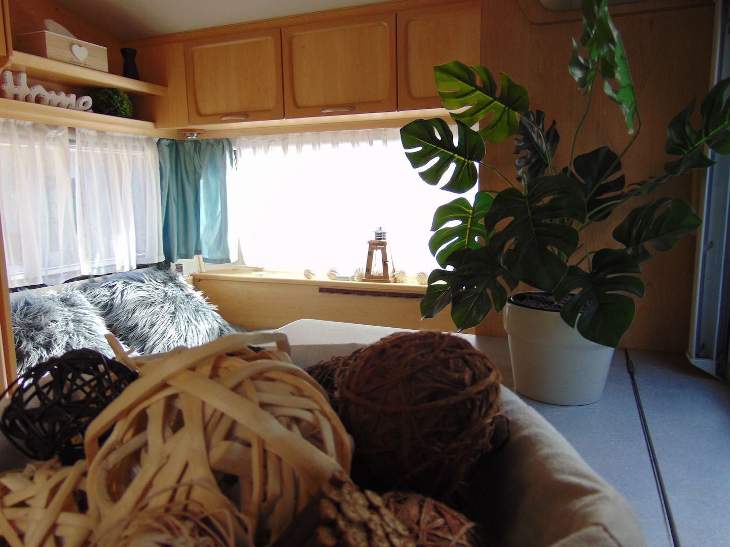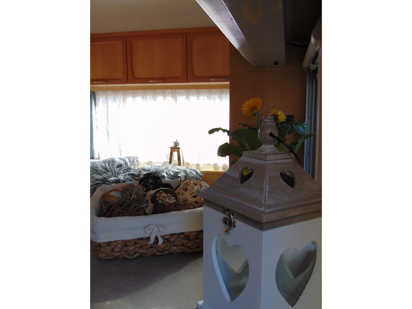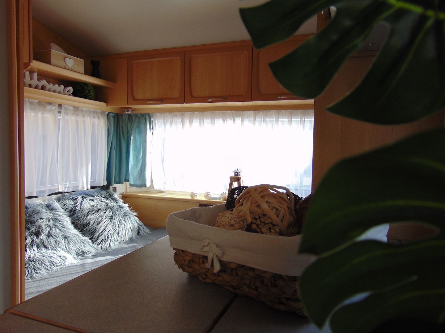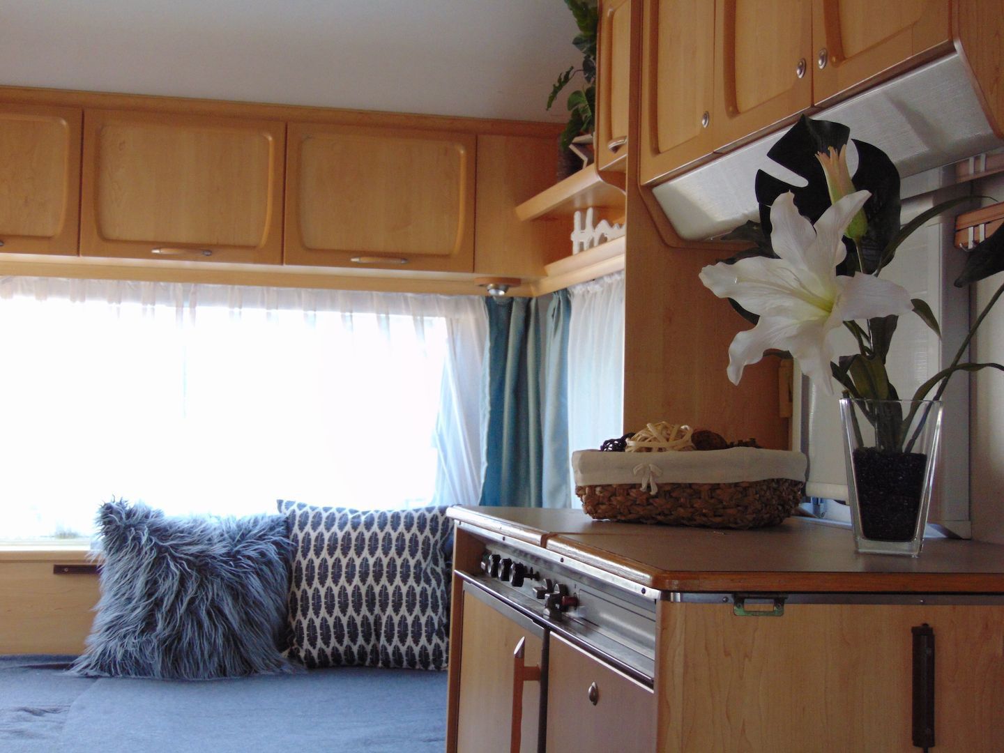 Van benne két franciaágy - egyik leválasztható és a másik asztallá, ülősarokká alakítható -, konyharész hűtővel, gáztűzhellyel, mosogatóval, klíma, mosdó, WC. Van még egy zárt elősátra is asztallal, székekkel.