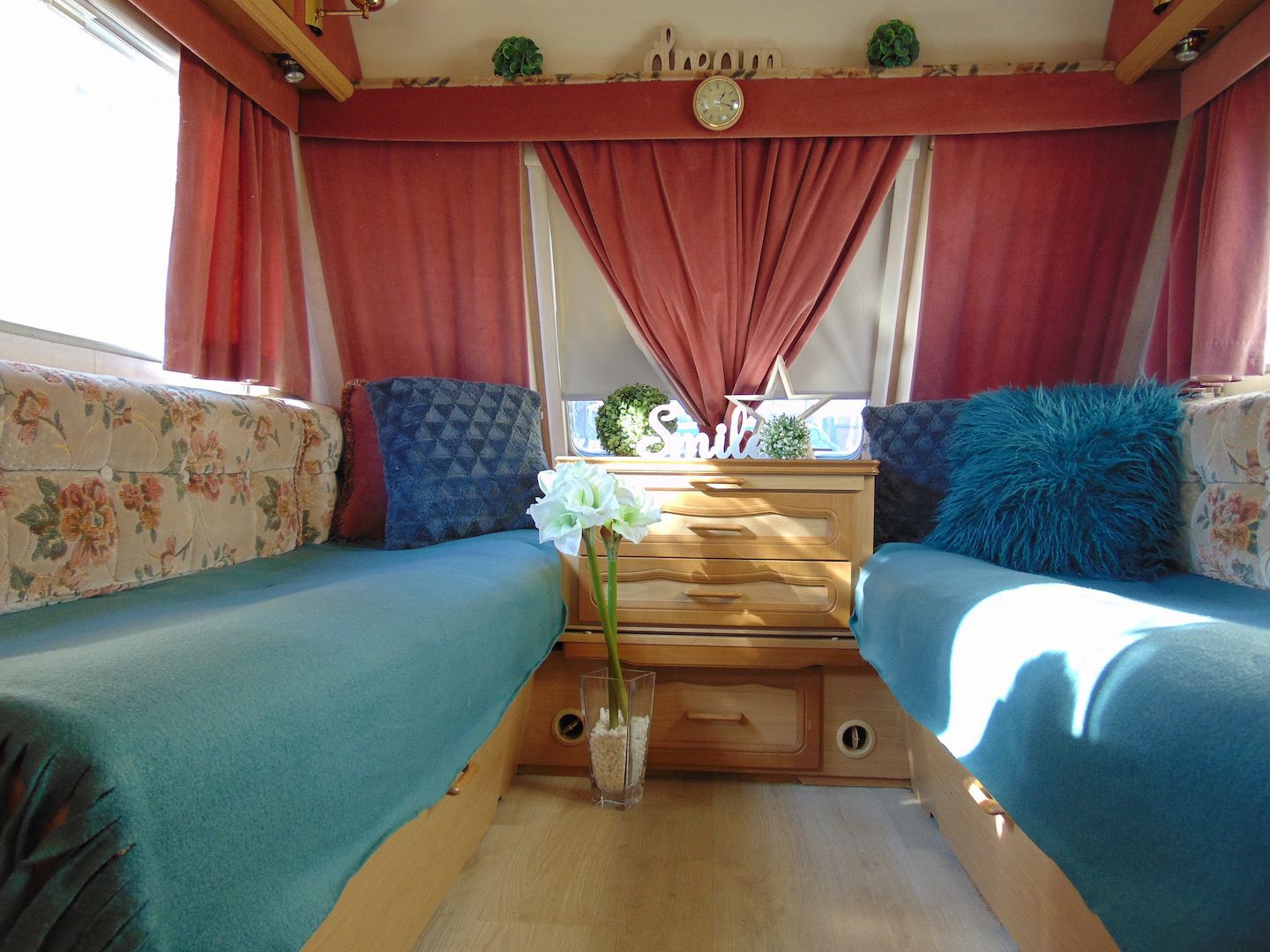Egy hatalmas, akár három személy számára is kényelmes franciaágy mellett, van benne még egy kétszemélyes ágy és egy kisebb emeletes ágy egy gyermek részére.